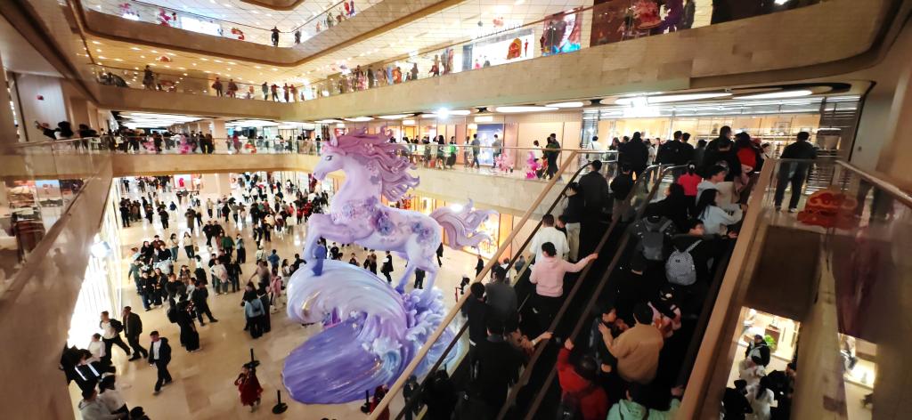 2月21日,南京德基广场商场内人潮涌动,商场一层矗立的马年主题生肖装置格外引人注目。新华社 记者潘晔 摄