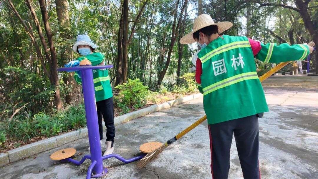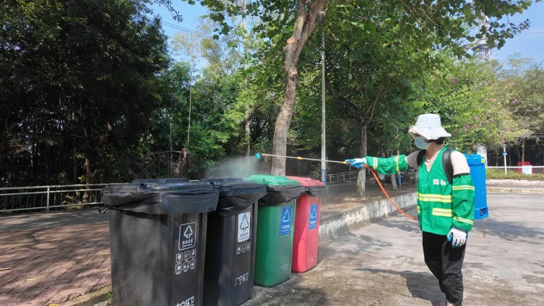 在翠竹公园,这里每天都有市民前来晨练、运动、玩耍。工作人员首先检查了公园内基础设施以及园内环境的卫生情况。据园林管理所相关工作人员介绍,每天早上、下午清洁人员都会对公园内的垃圾桶进行清理,以及喷洒防蚊药水;同时对公园内的林区每天进行两次的蚊虫消杀,特别是对高大乔木的枝叶、低矮灌木的根部进行细致喷洒,以防蚊虫的孳生。